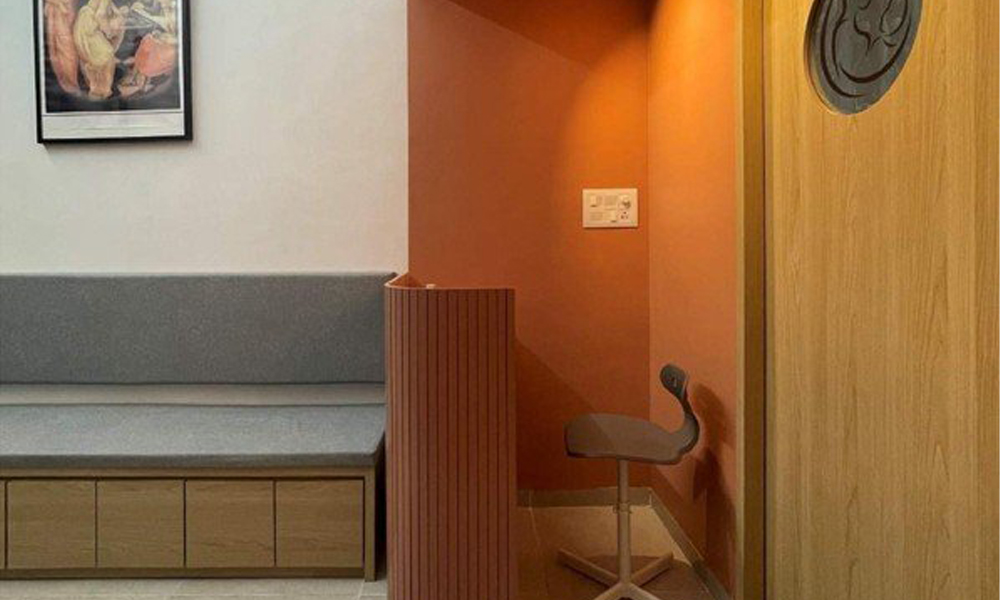 A contemporary gyneac clinic designed with a peach theme and pops of color, blending warmth and freshness with clean lines and functional layouts.